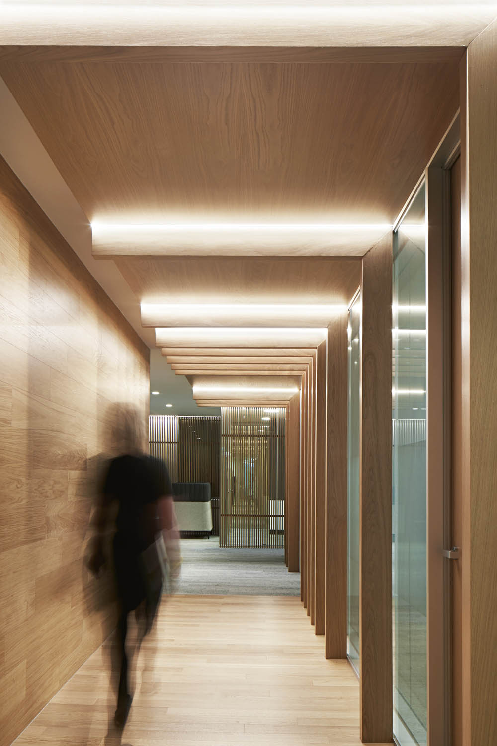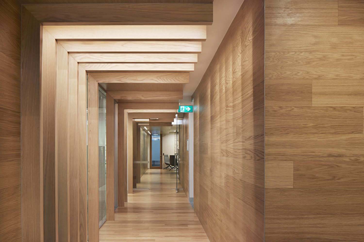 The key thoroughfare to the client area becomes a modern cloister with strong timber banding leading to the meeting spaces. Symbolic entry doors create a strong opening to meeting rooms and mirrored light fittings reference the fixtures and fittings at the altar.