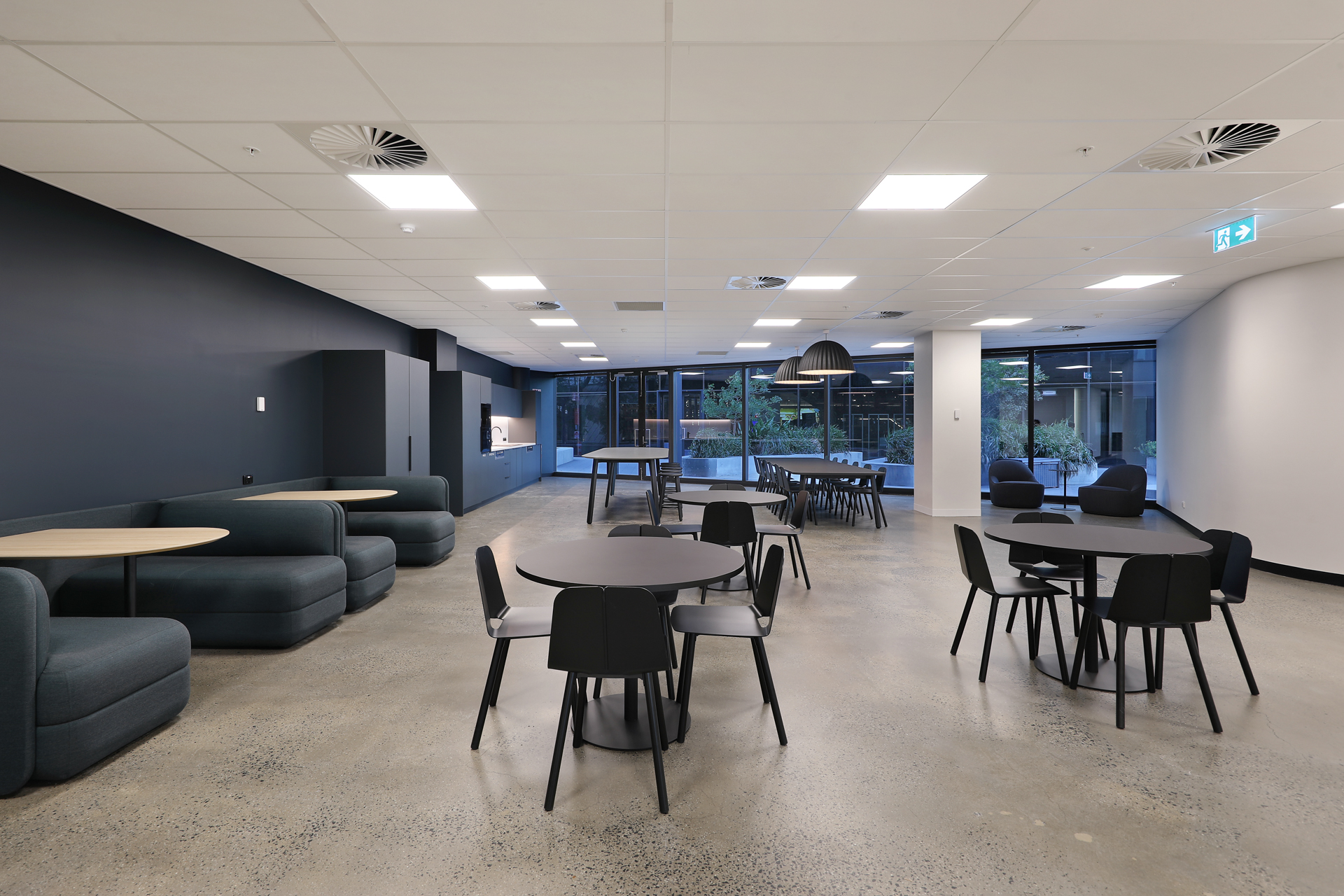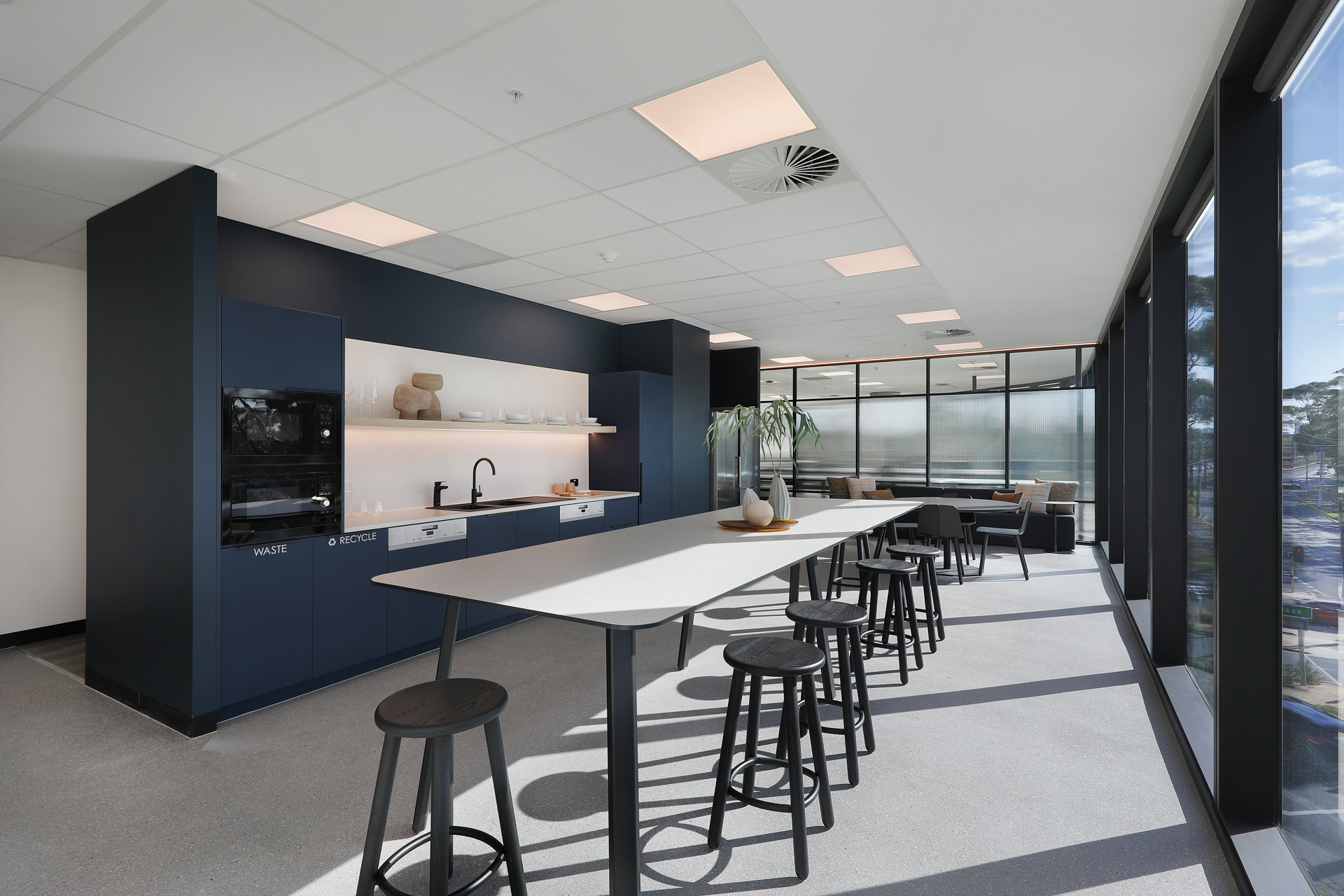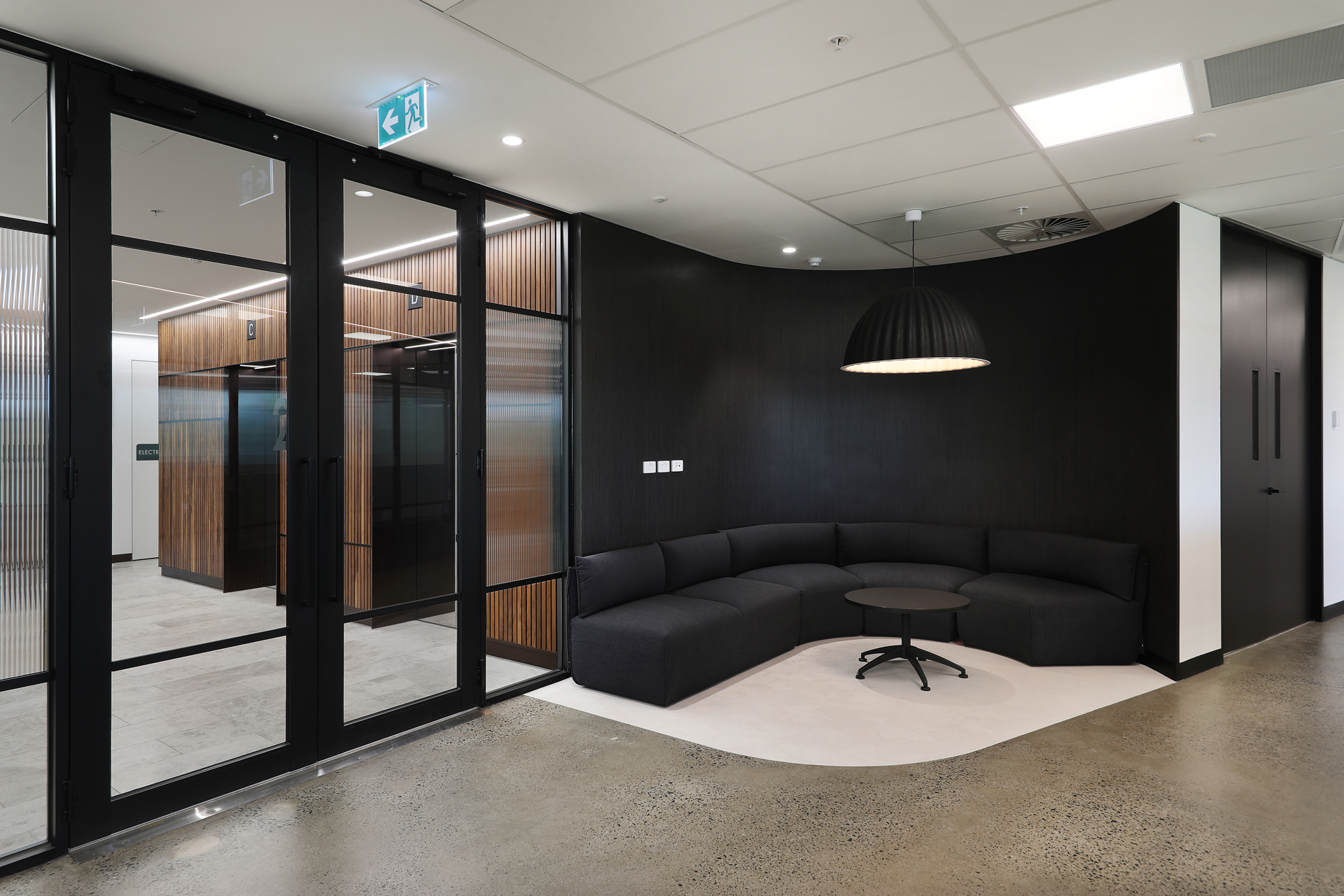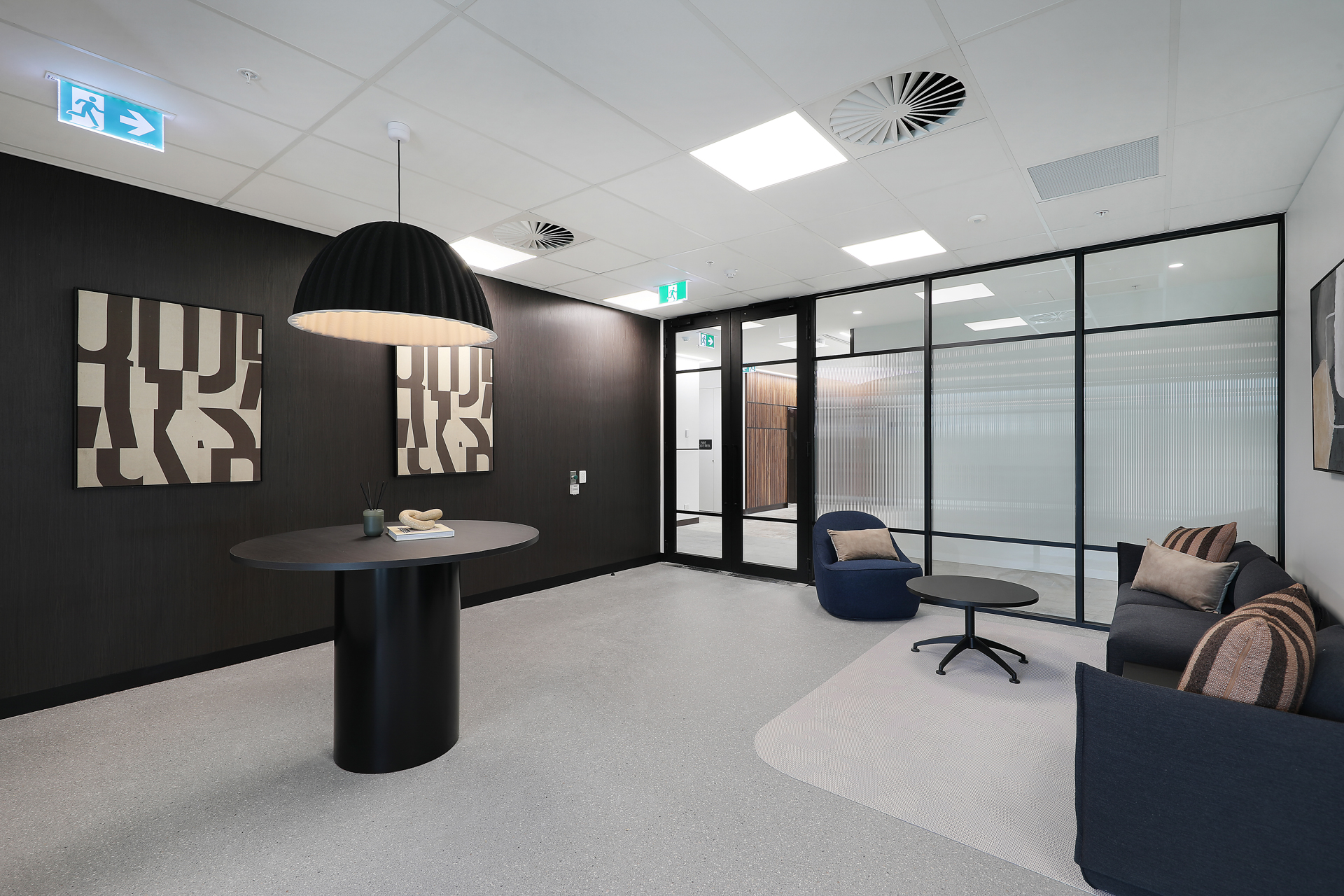 The design compliments the unique attributes of the building’s architecture with strong contemporary framed lines and curved forms. Black framing with reeded glass highlights, forms a bold and contemporary design feature across all tenancies. The palette is neutral, with muted monolithic colour linking the interior to the colours of the landscape beyond. Each tenancy is mildly different in tone, balancing muted Eucalypt greens with deep dark blues in key feature spaces.