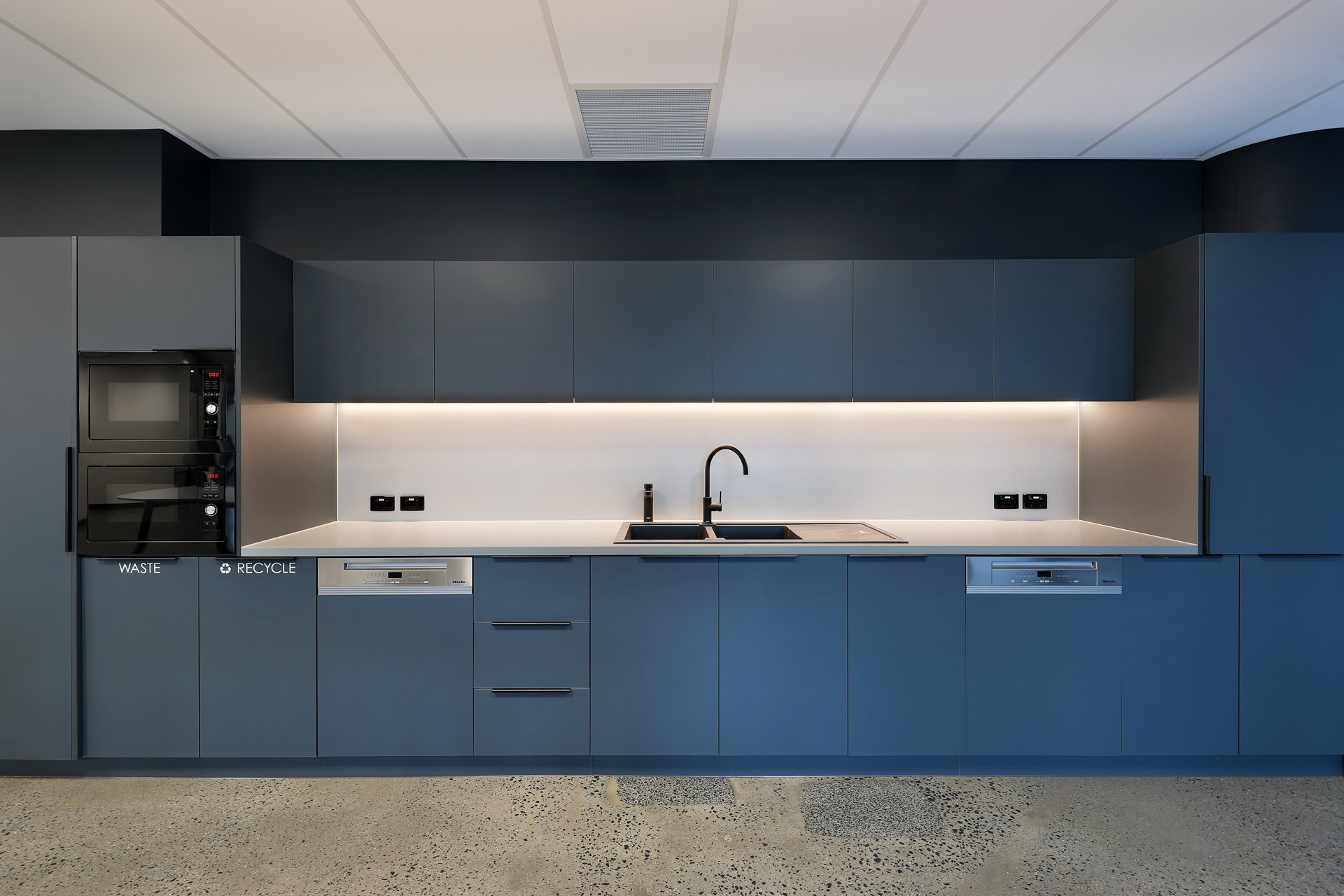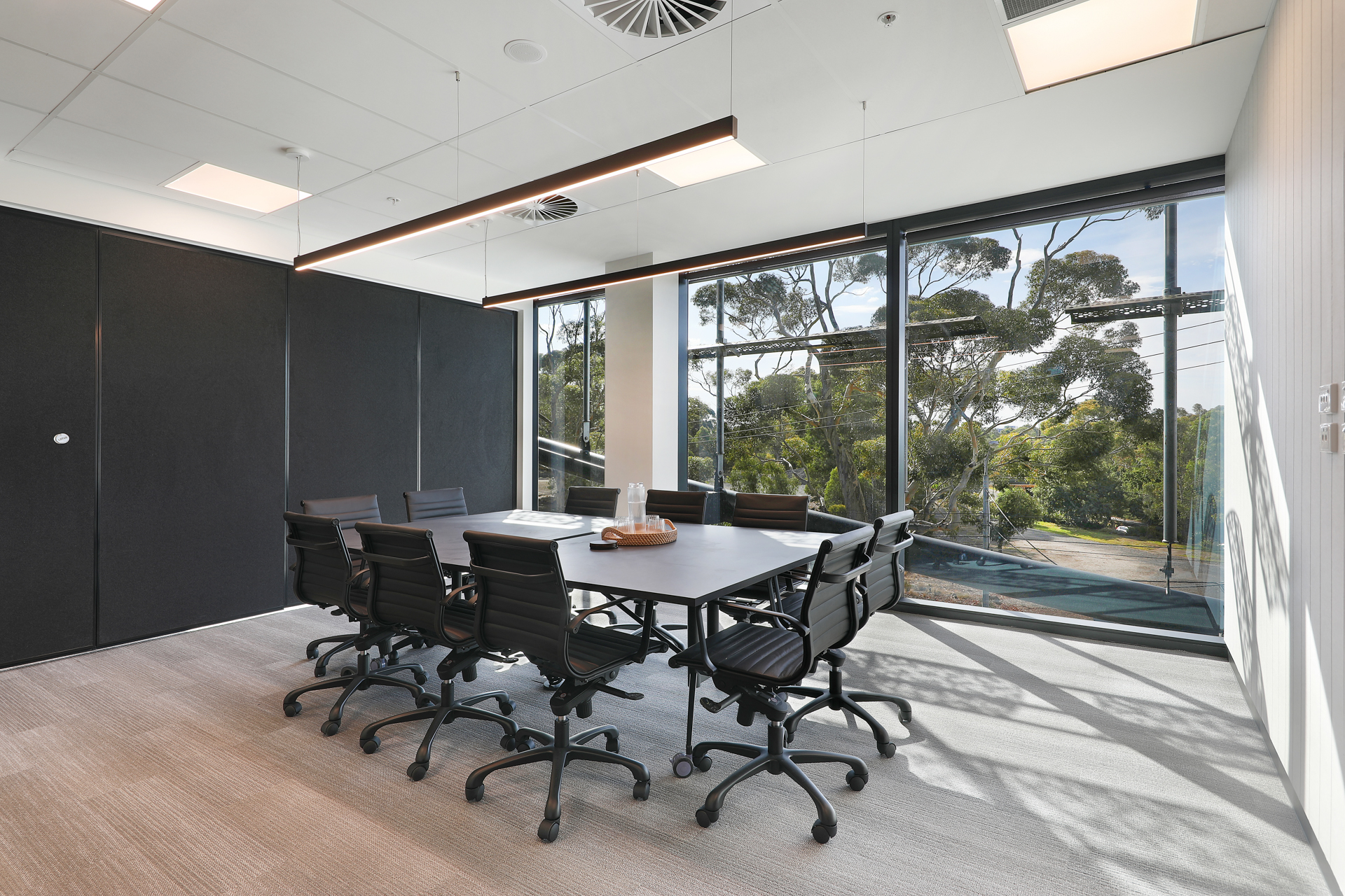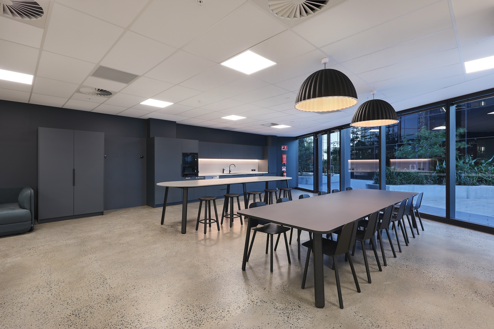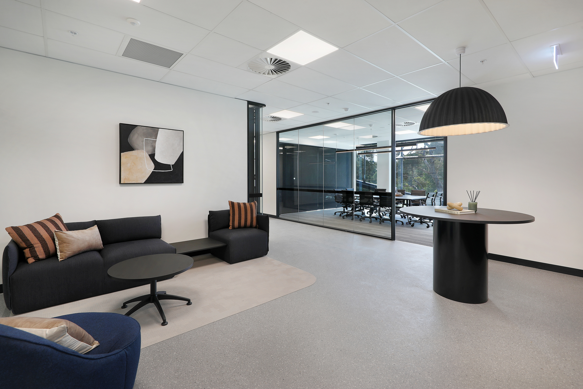 The design compliments the unique attributes of the building’s architecture with strong contemporary framed lines and curved forms. Black framing with reeded glass highlights, forms a bold and contemporary design feature across all tenancies. The palette is neutral, with muted monolithic colour linking the interior to the colours of the landscape beyond. Each tenancy is mildly different in tone, balancing muted Eucalypt greens with deep dark blues in key feature spaces.