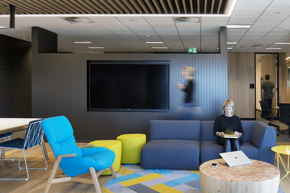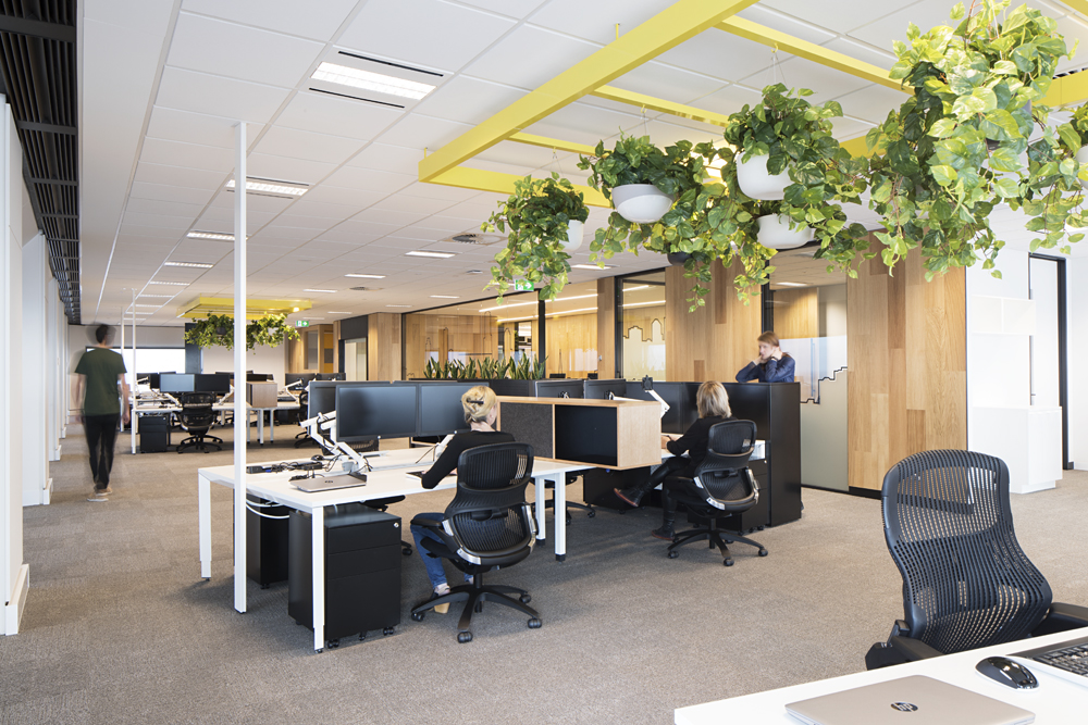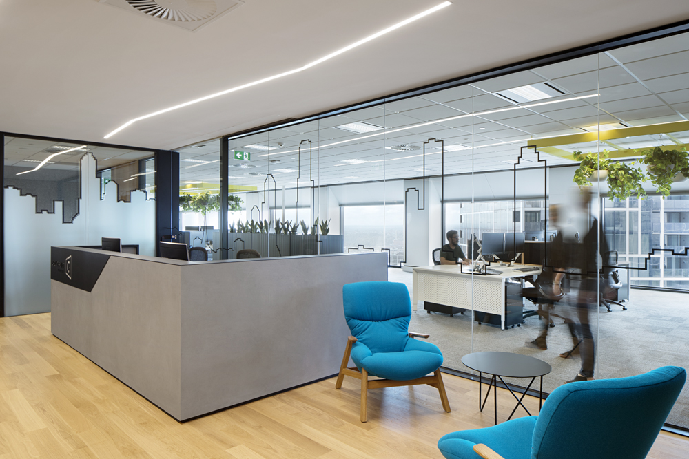Growthpoint Properties own and manage quality commercial properties within Australia. Linear were engaged to create an engaging workspace that showcased their core business in property and reflected Growthpoint as progressive, transparent, professional, diverse and fun. The philosophy behind the design concept was to reinforce a strong connection with property through a design language developed around the characteristics of the modern urban environment. In particular developing spaces inspired by buildings, plazas and sky gardens.Built zones took on the form and finishes of modern architecture, the breakout became a plaza – a place to gather – with trees, finishes and furniture with an outdoor feel. Amongst the workspace hangs the sky garden bringing greenery, views and a sense of rooftop balcony to the open plan work environment.The line between formal space and workspace is blurred through the very transparent wall at reception reinforcing openness and transparency and connecting reception staff to the broader team. A skyline graphic forms a strong decal and references the outstanding iconic Melbourne views seen from their workspace. Growthpoint have adopted a very open and collaborative working model allowing maximum long term flexibility and enabling greater collaboration between teams. Amongst the workspace are teaming pods, booths and furniture solutions – all wired up with technology – to provide places for teams to work and meet in a more informal environment.