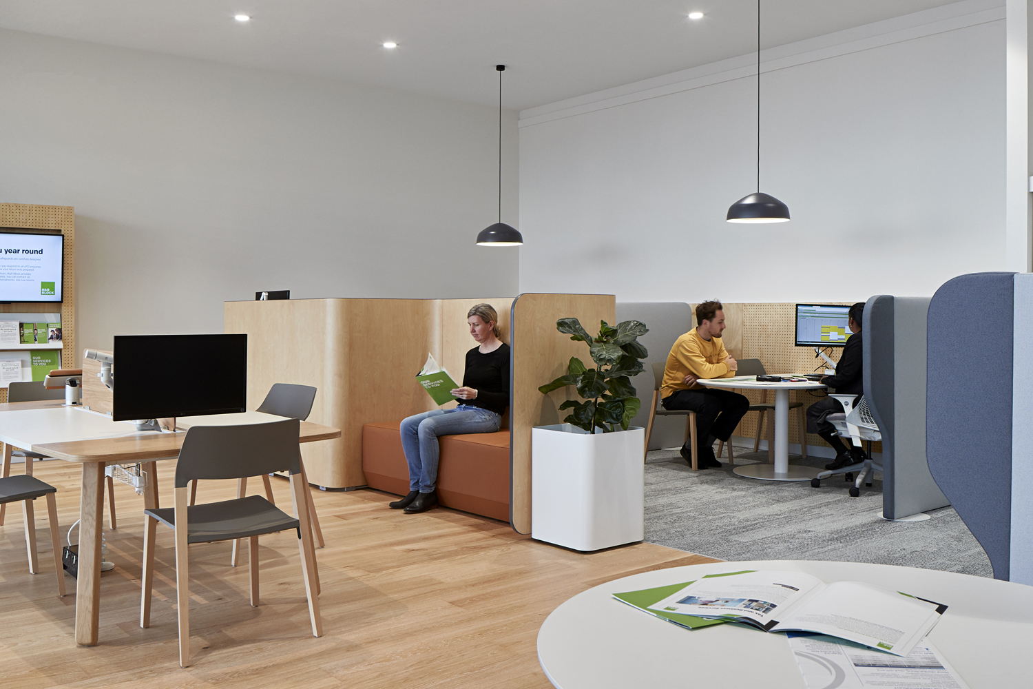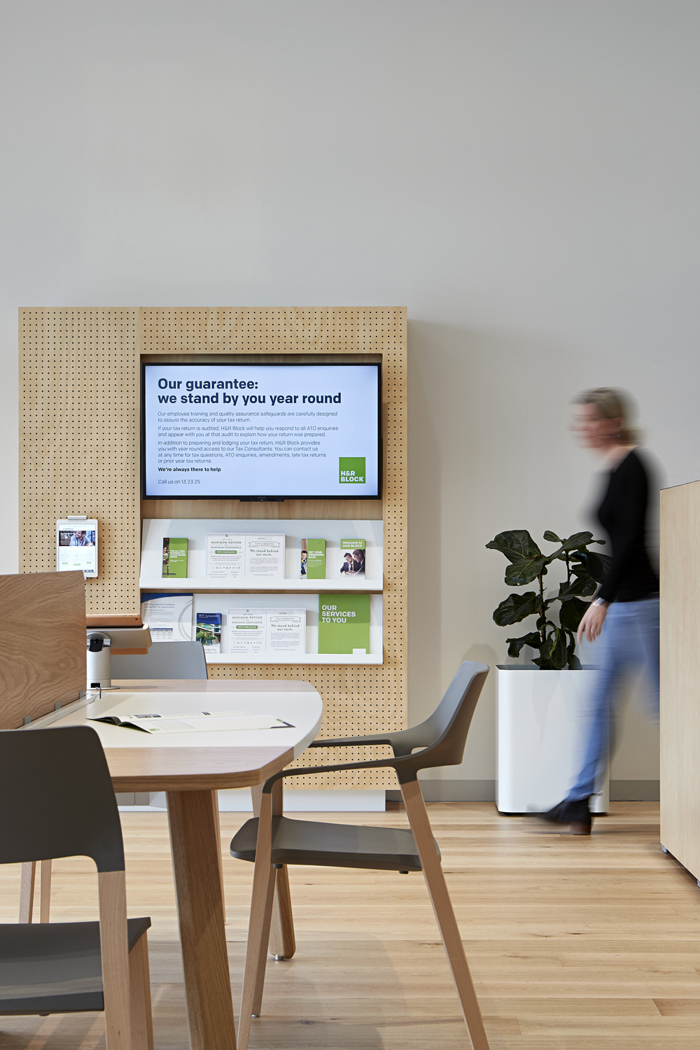 The design solution encourages more personalised interactions with customers through more open and welcoming settings. The H&R Block “green” continues to have presence but is more strategic and focal in its application.