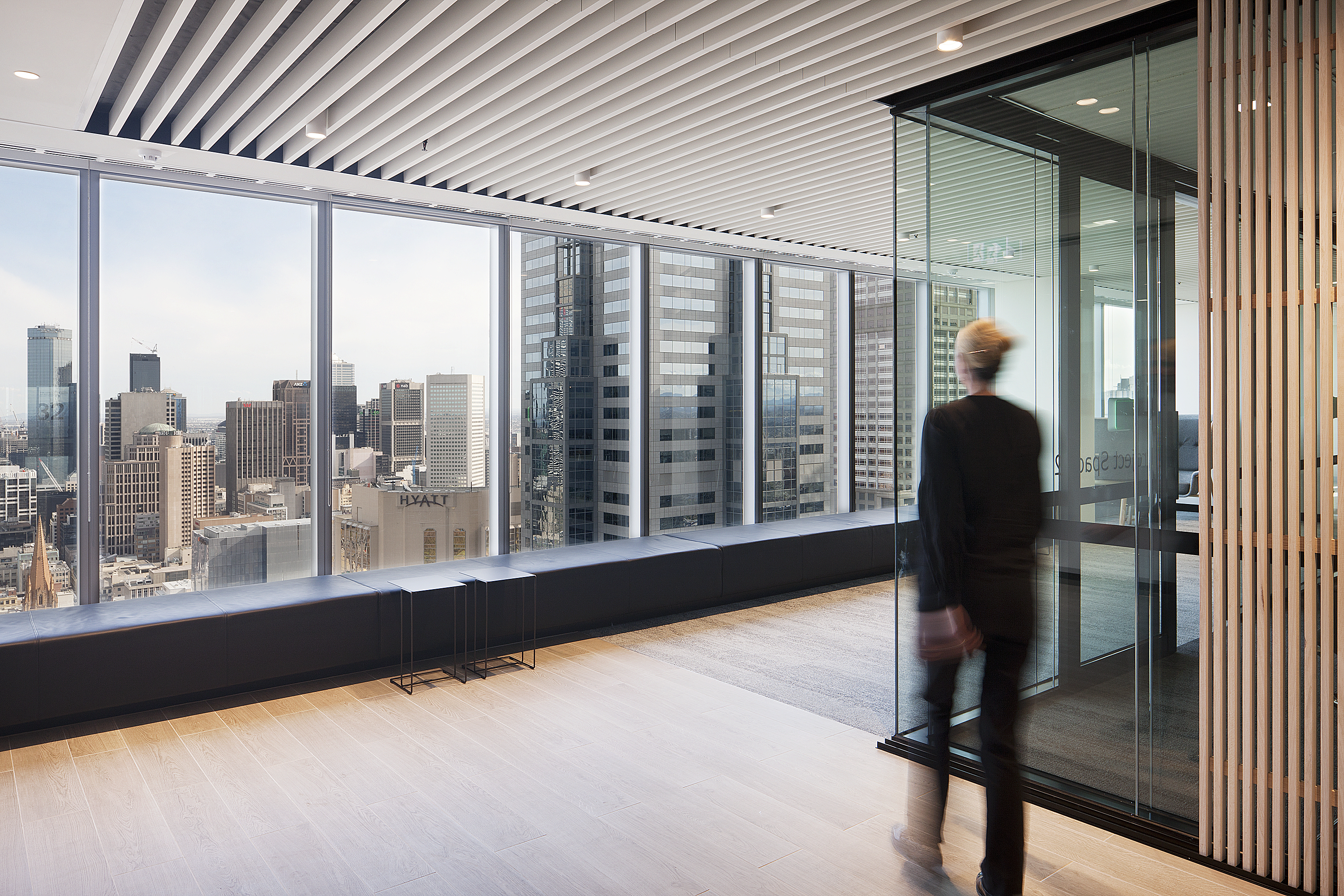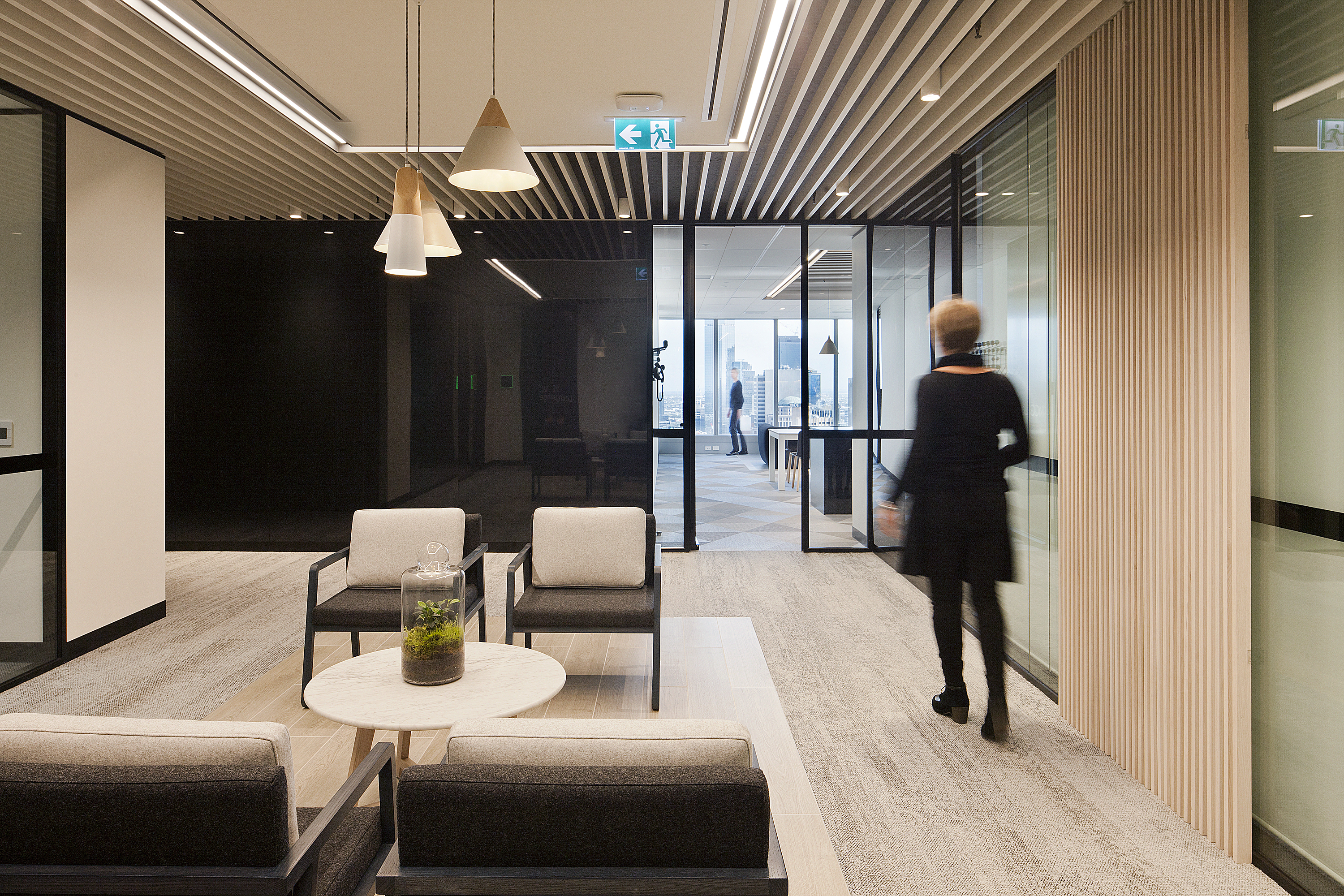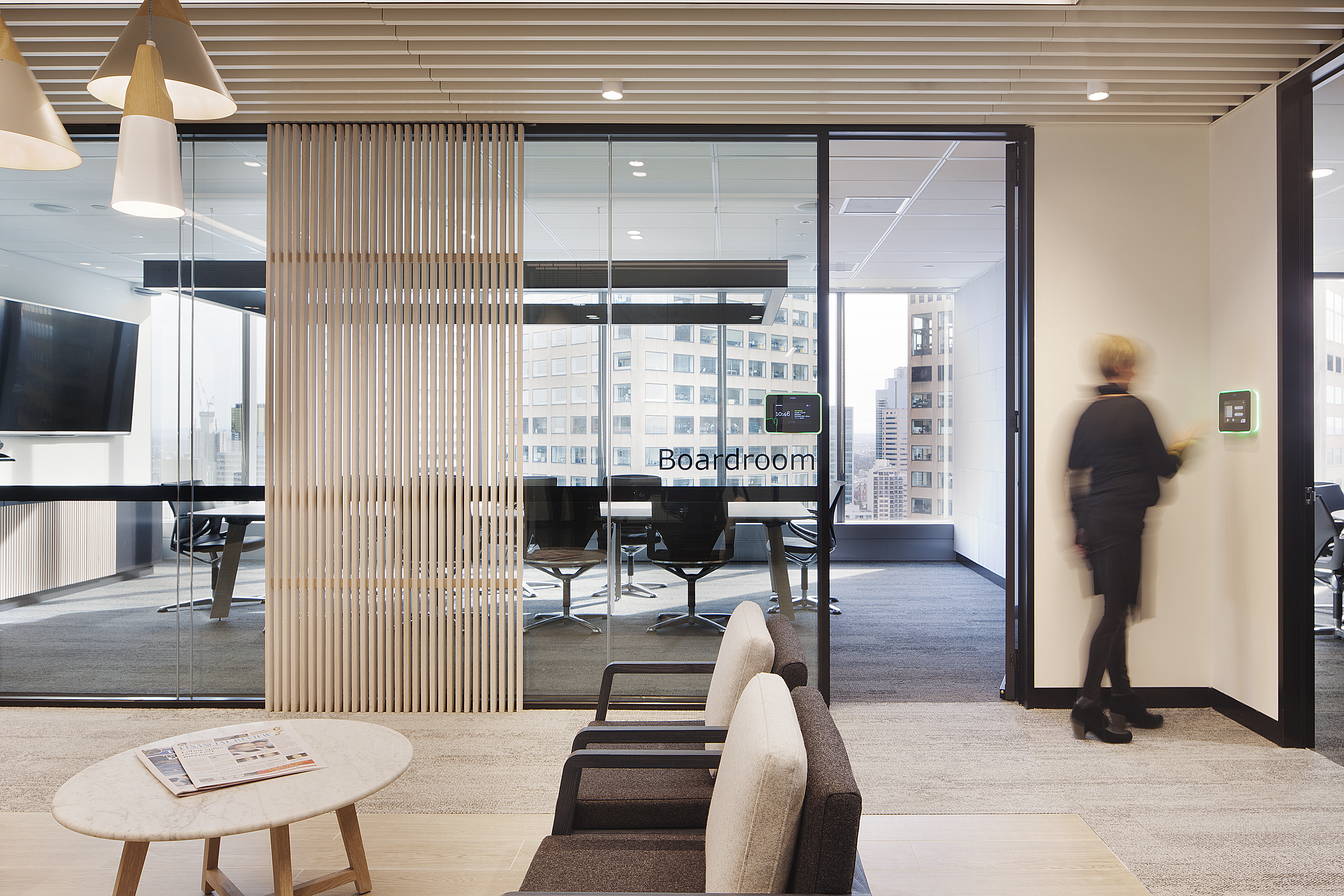 The look and feel is contemporary and timeless, with a creative edge. LEK are known for being more creative than their competitors and we showcased this throughout the design by incorporating a variety of spaces that inspired creative thought and enabled them the freedom to excel. These were strategically located at arrival points and amongst the formal client spaces, to further reinforce this to clients and allow glimpses into the project spaces to see LEK people working creatively. Slatted timber sliding screens allowed a level of transparency into these spaces whilst still providing the ability to morph into more privacy when required.