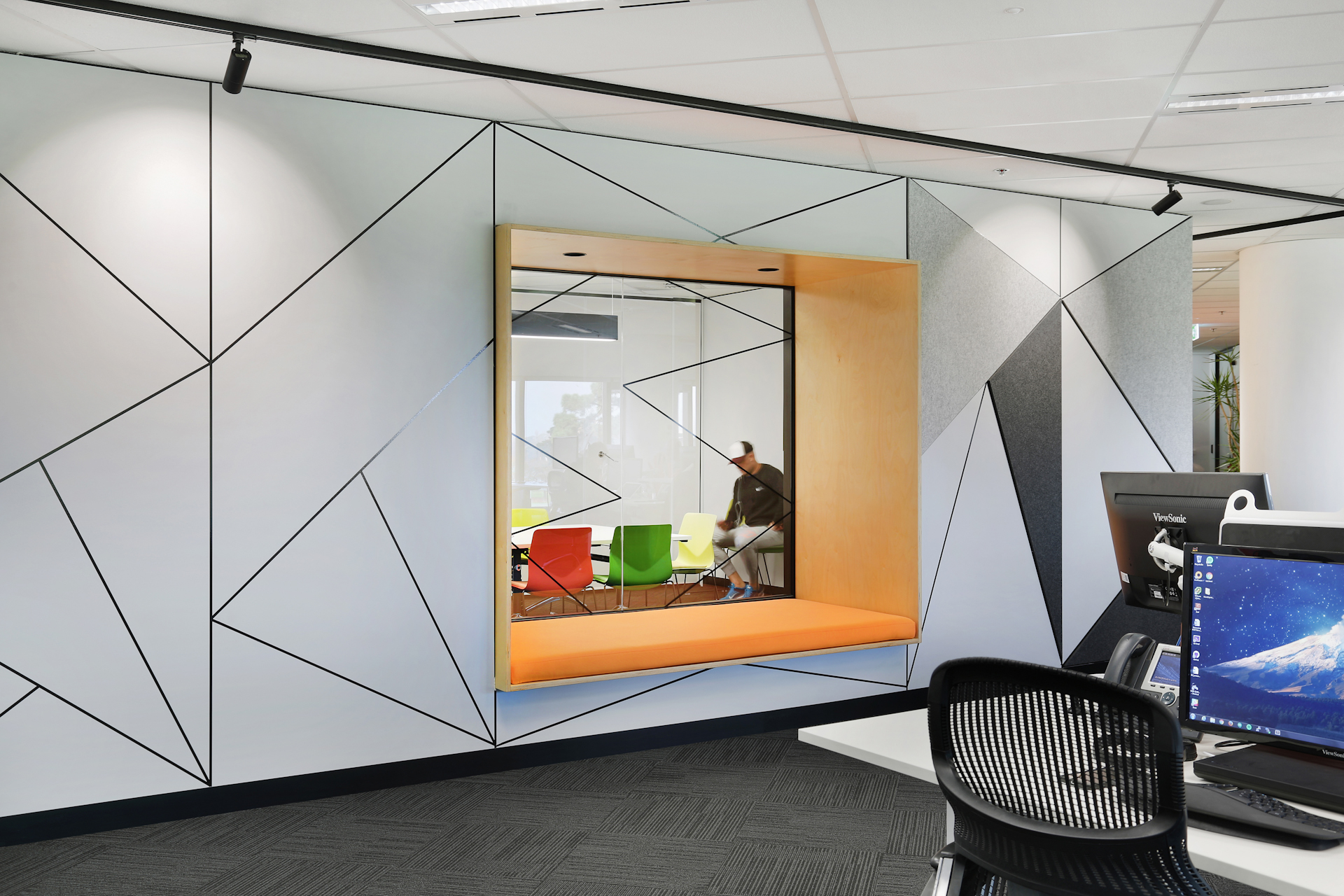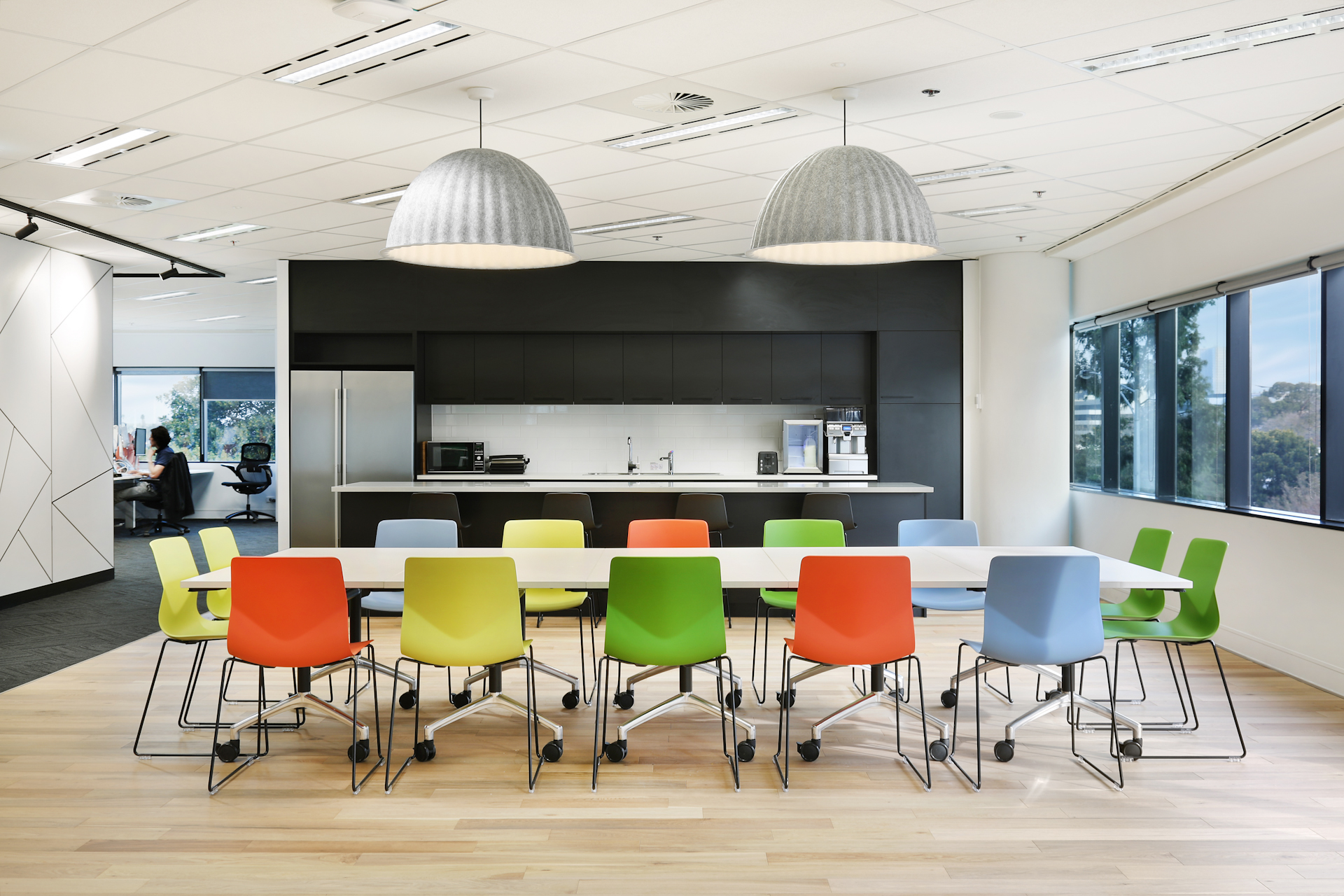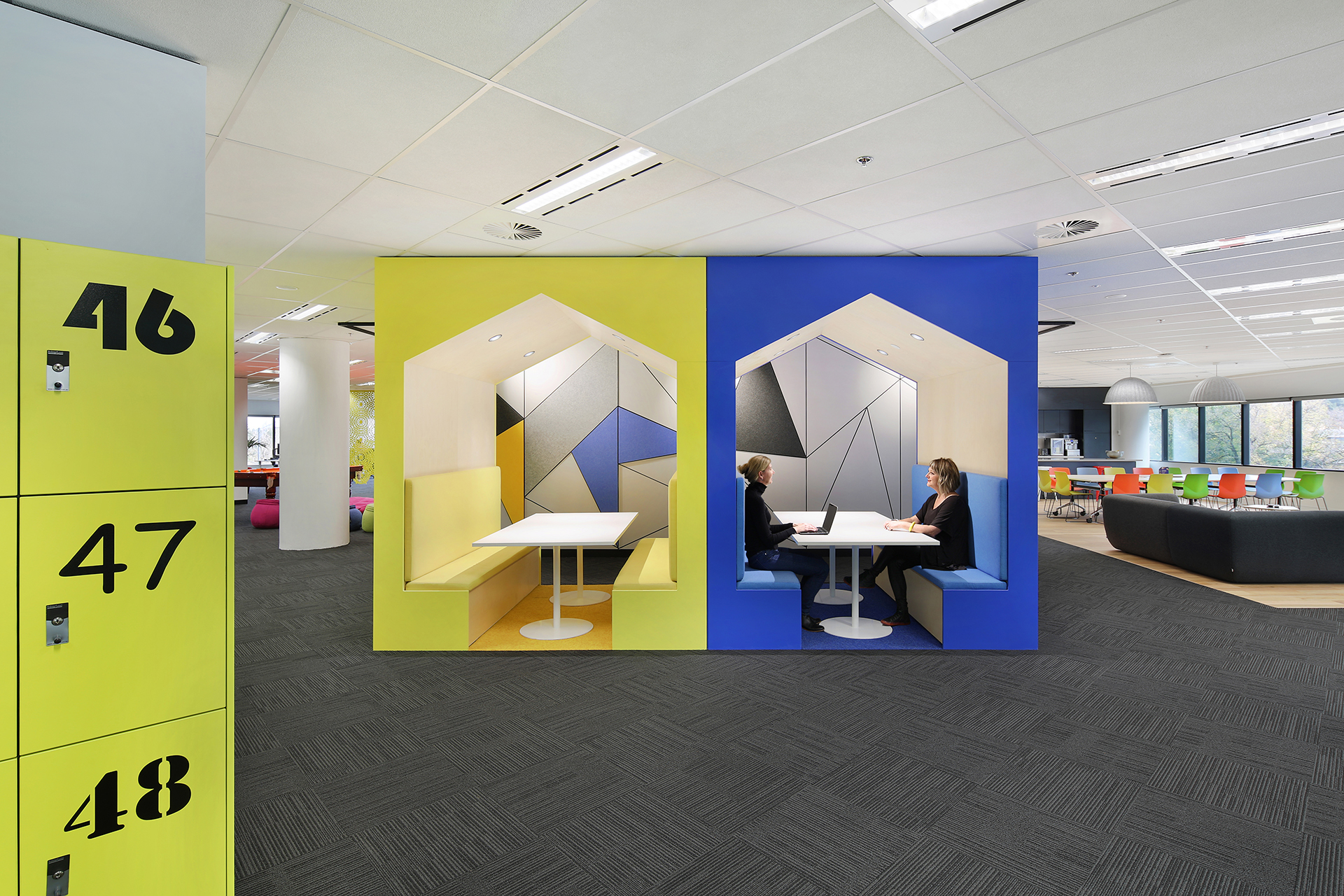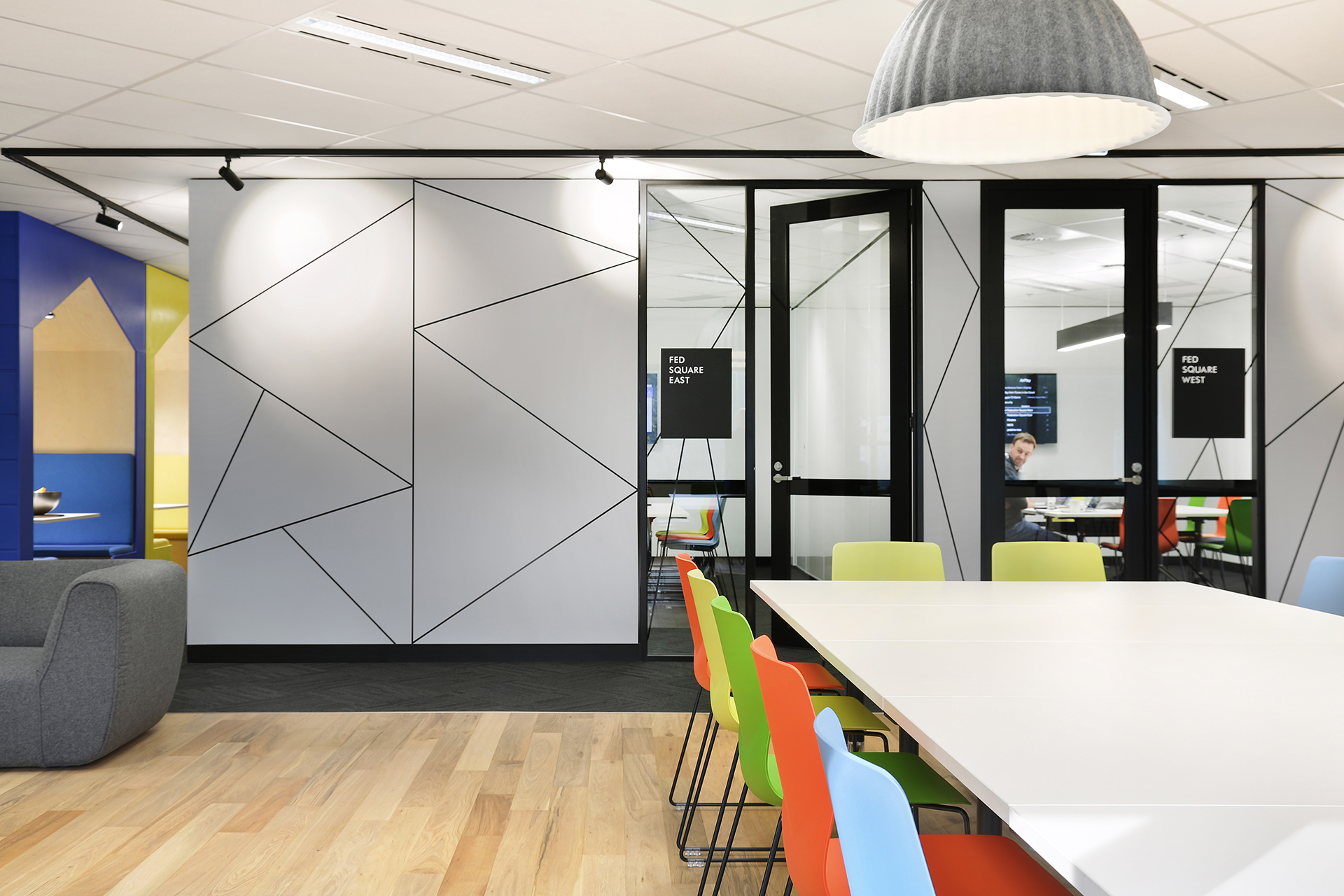 An arena space provides a stepped platform environment to brainstorm and gather in groups. Other spaces are focused around smaller gatherings and the individual workspace. Being a global organisation, it was important for the Melbourne team to bring local references to their space and the design language evolved around Melbourne Icons and the strength of colour.
