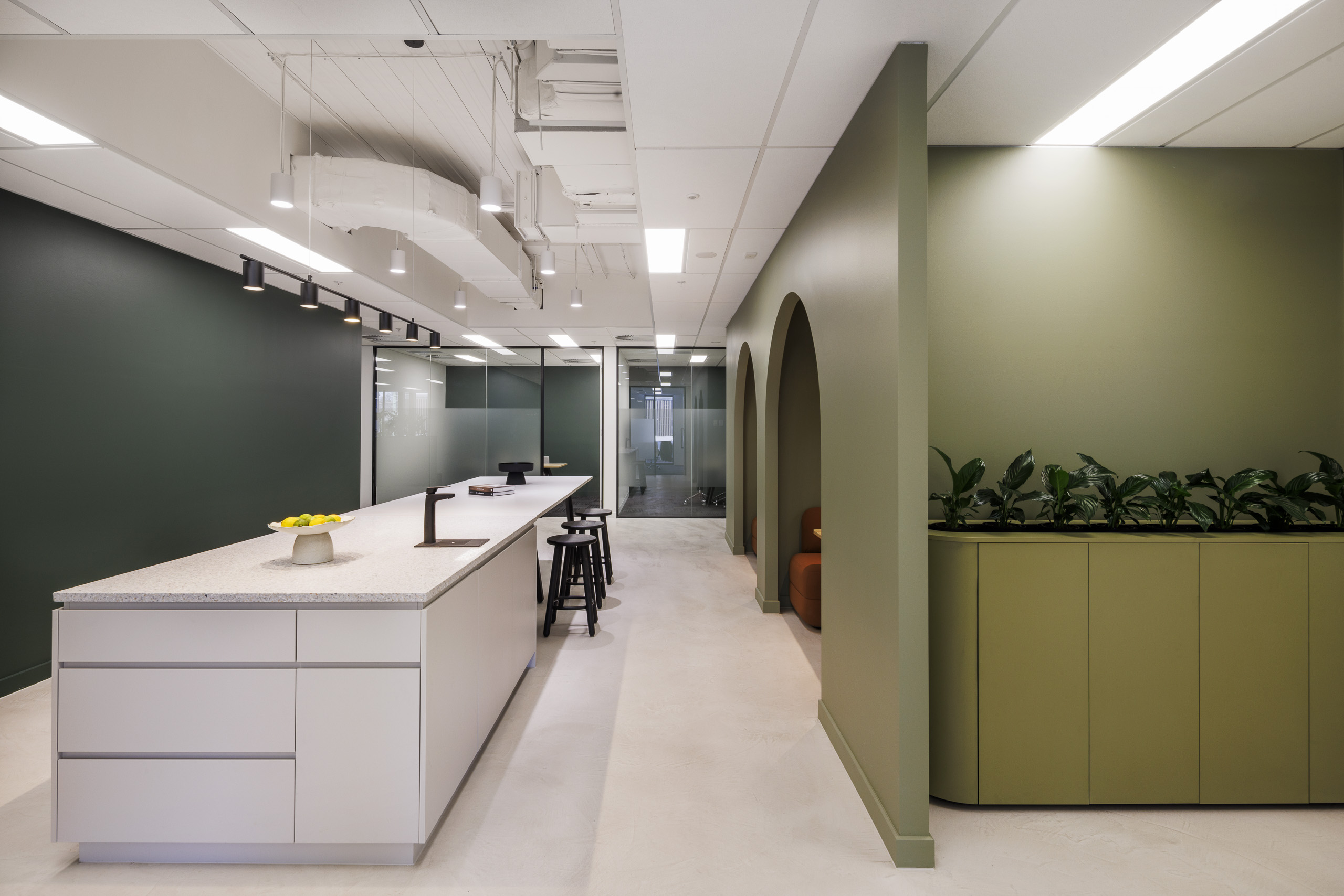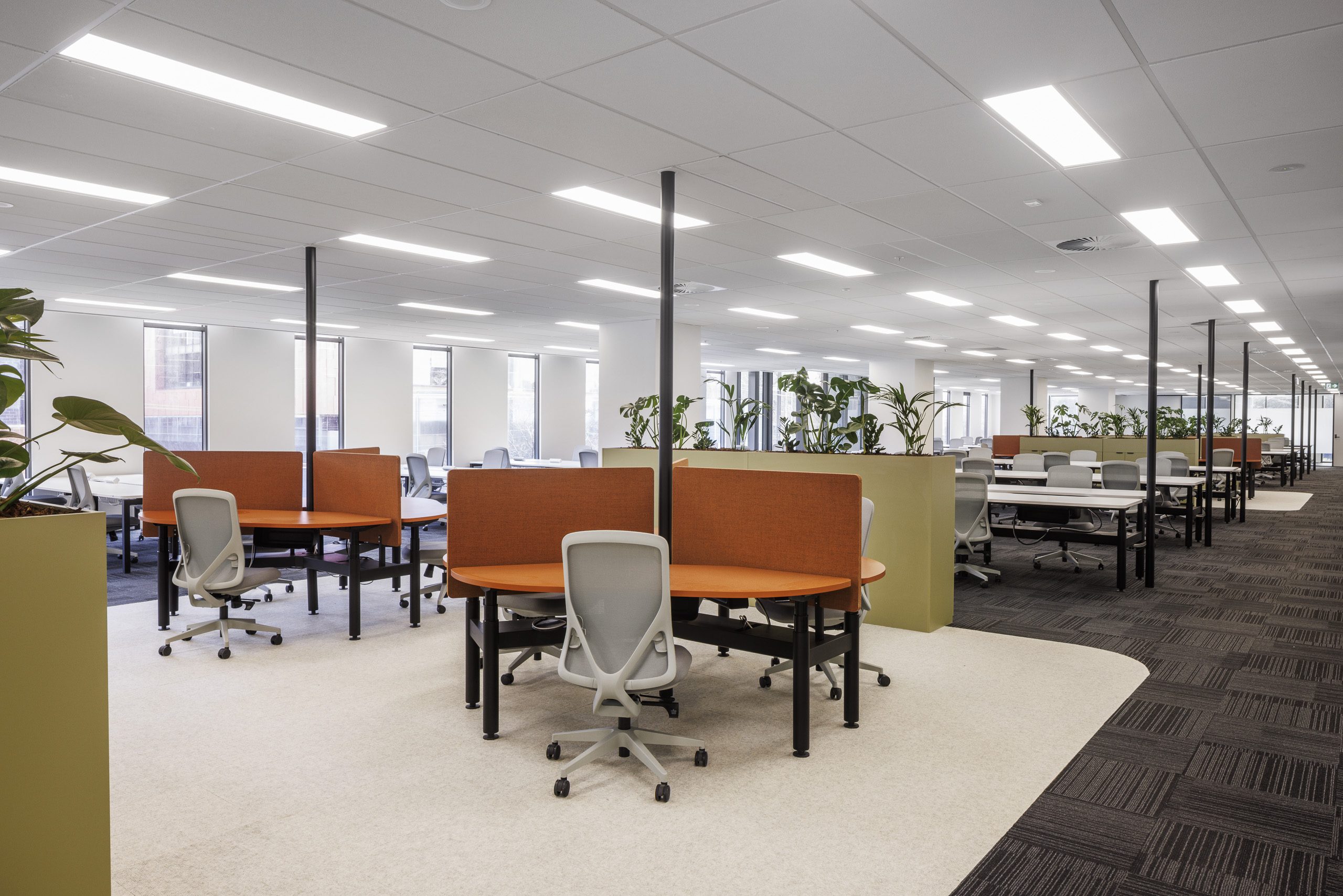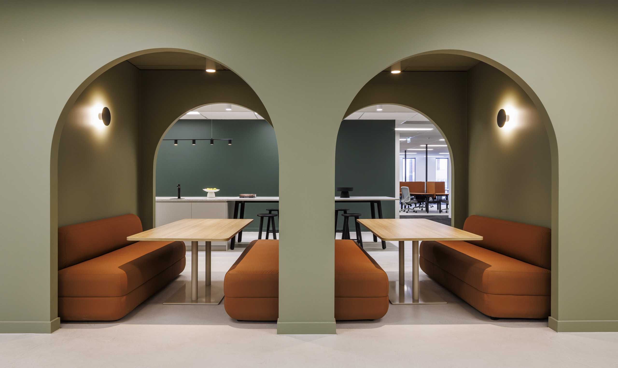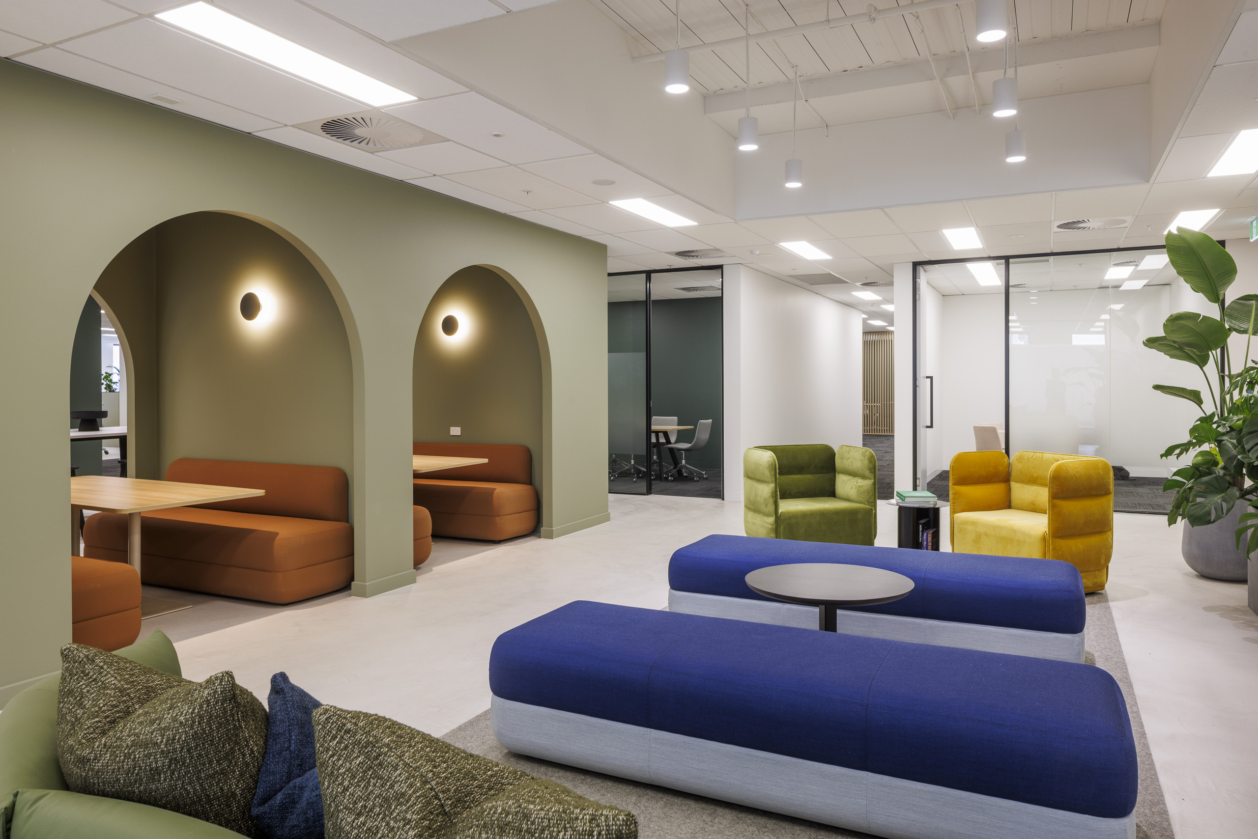 Overall, the design overlay brings playful colour, soft corners, soft furnishings, plants and a contemporary youthful aesthetic over what was a very traditional, rectilinear office based environment.
