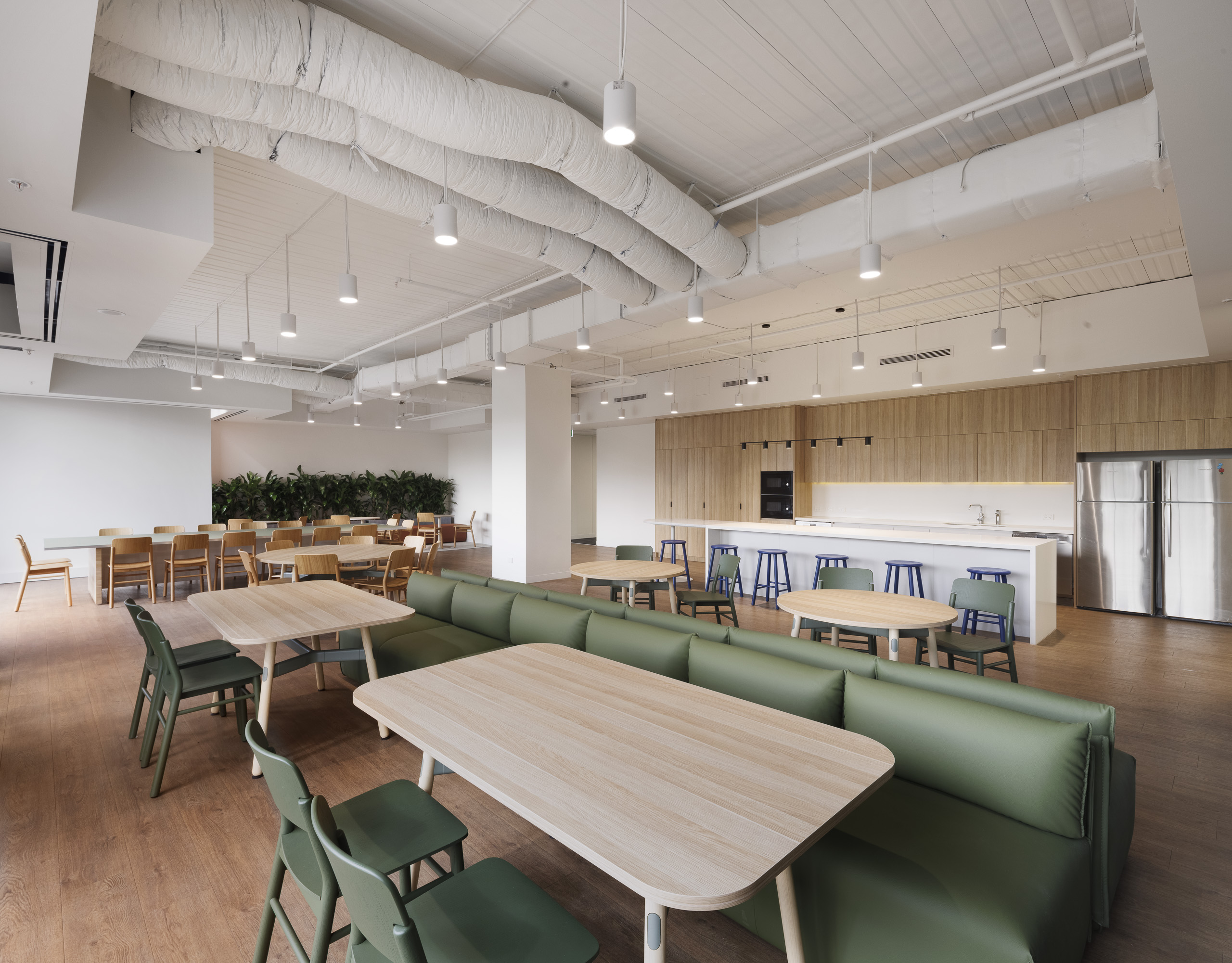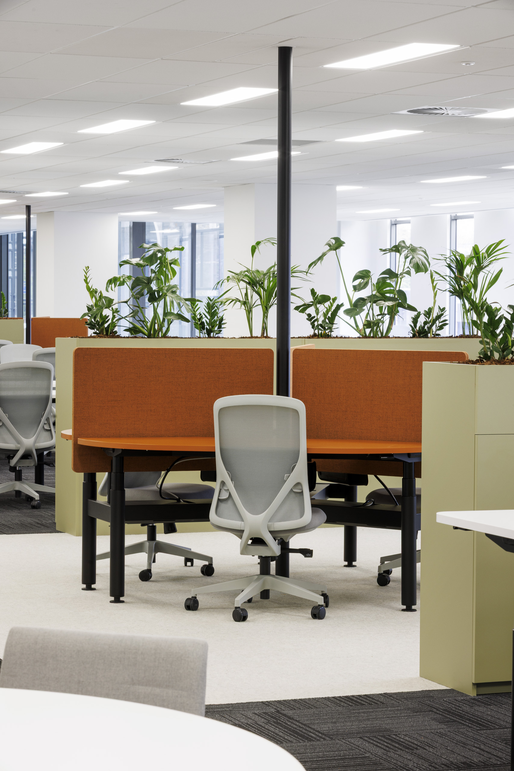 Through collaborative furniture settings and booths, there are spaces to wait, meet informally, work informally and breakout from the larger formal meeting spaces in the arrival zone. The new overlay brings together a sustainable approach to re purposing existing elements where practical. A mix of new and reused furniture and workstation elements were used or “re dressed” to bring new life to these pieces.