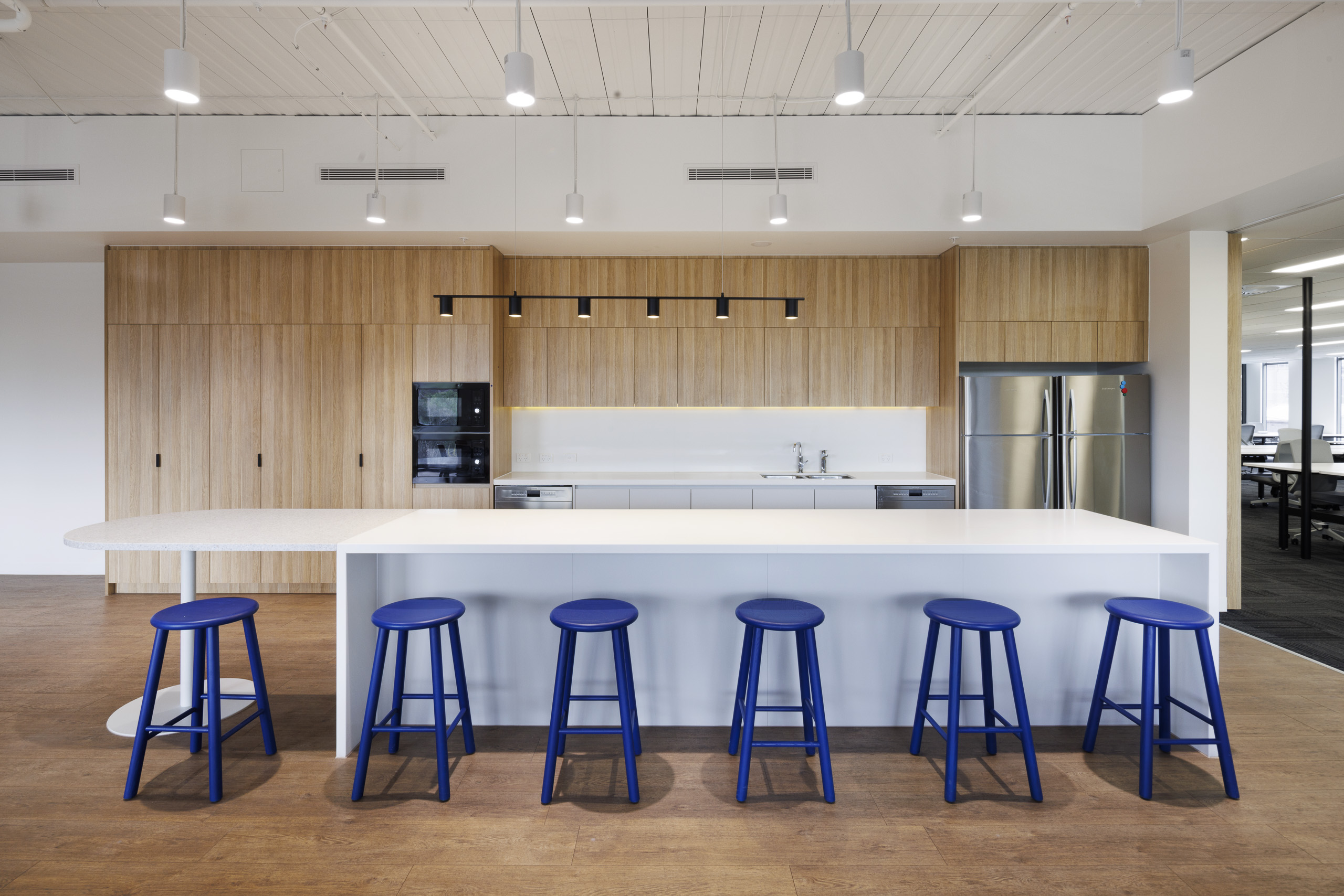 Through collaborative furniture settings and booths, there are spaces to wait, meet informally, work informally and breakout from the larger formal meeting spaces in the arrival zone. The new overlay brings together a sustainable approach to re purposing existing elements where practical. A mix of new and reused furniture and workstation elements were used or “re dressed” to bring new life to these pieces.