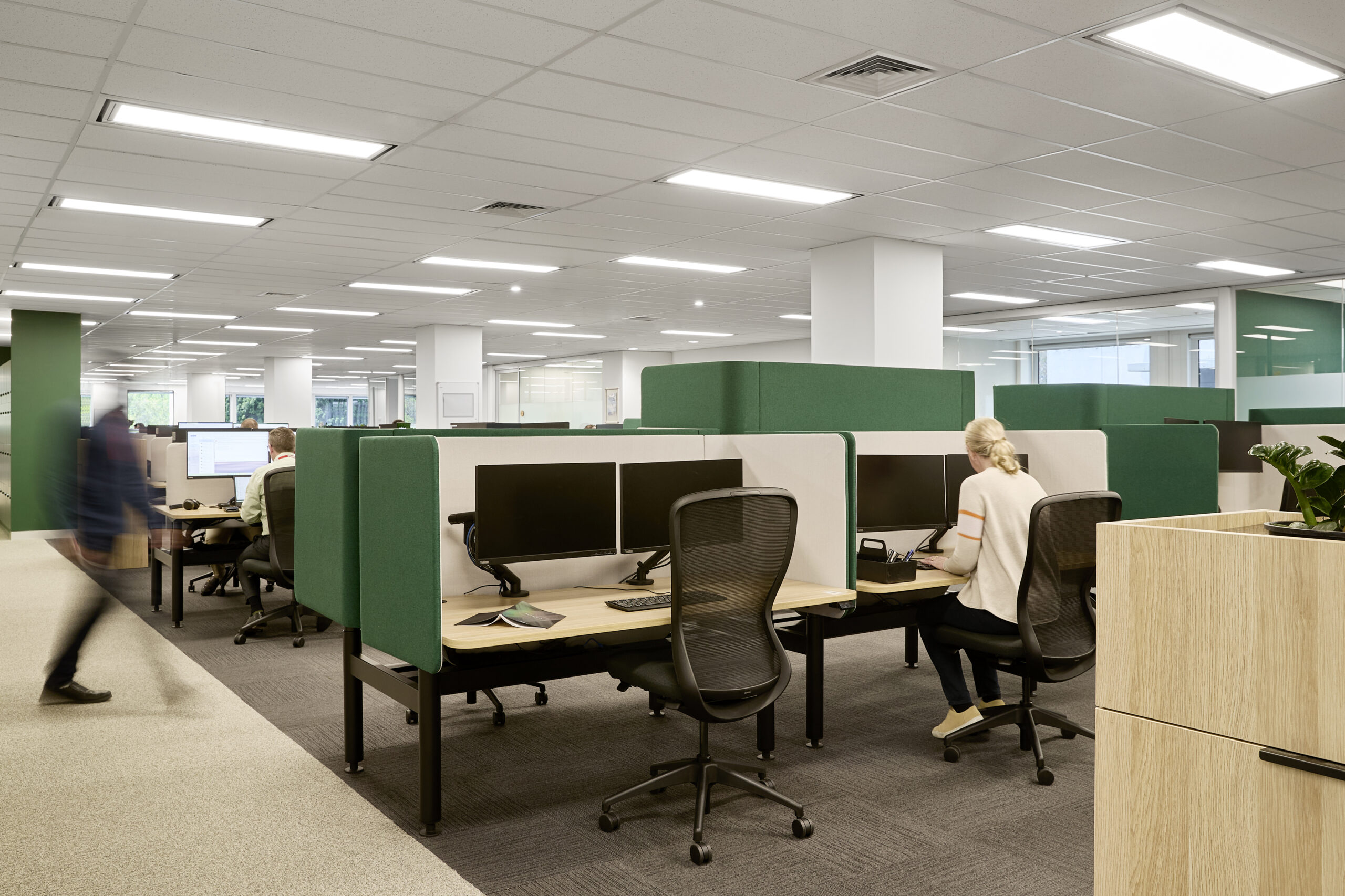 The new workplace brings together a sustainable approach to re purposing existing elements where practical, overlayed with a new warmer base. juxtaposed with bold colour accents and graphics to key focal areas to represent the energy of the new brand.